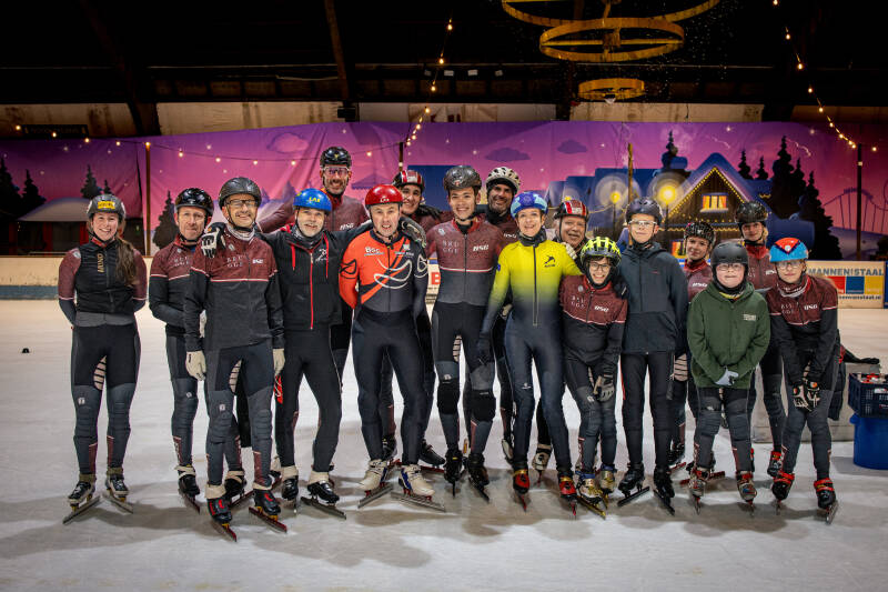 Verder startten we dit jaar met een grote toeloop aan jonge beginners die op dinsdagen komen kennismaken met shorttrack. Nog niet eerder hadden de trainers van groep 1 zo hun handen vol, zeker met trainer Franky die tijdelijk vanaf de zijlijn moet coachen. Ook binnen groep 2 raken steeds meer leden overtuigd om aan competitie te doen. Zetten we dit bij de goede voornemens voor dit jaar, Floris, Timofey en andere geïnteresseerden? Ook Mauro, die tegenwoordig in Hasselt traint maar op wedstrijden nog steeds de Brugse clubkleuren verdedigt, gaat opnieuw voor een jaar vol wedstrijden. Het WK voor junioren in Salt Lake City viel dit jaar misschien nog te vroeg en is natuurlijk niet goedkoop indien je die zelf moet bekostigen, maar hij geeft komend weekend alles tijdens een internationale wedstrijd in Boedapest. We wensen hem daar veel succes! Rino en coach Alexandra kruipen ook nog eens in hun nationale kledij. Zij treden komend weekend aan als vervangende bondscoach van de oud-teamgenoten die in Tilburg deelnemen aan het Europees Kampioenschap.